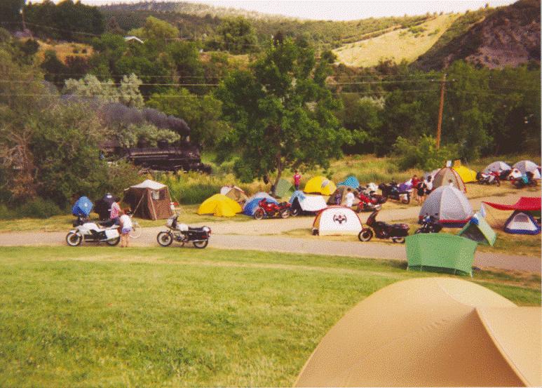 Finding the Rally site was easy. The flood of bikes must have looked like someone has stepped on an ant colony. The large parking lot was wall-to-wall bikes and every inch of shaded ground had a tent on it. After signing in and checking the bulletin board for pointers to fellow netters, we headed out to look for a campsite. A helpful staffer mentioned that there might be room to camp behind the ballfield so we wound our way through the sea of bikes and tents to find plenty of room albeit without any shade.