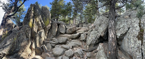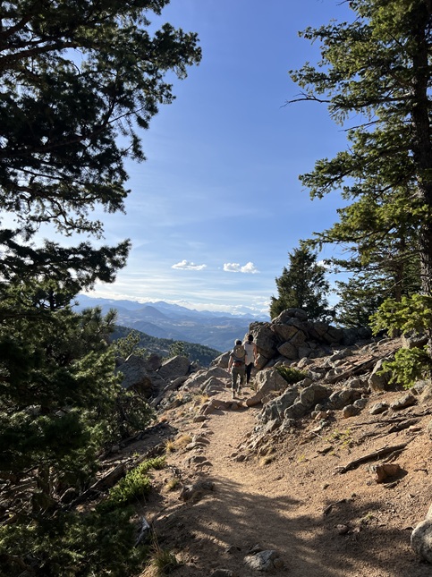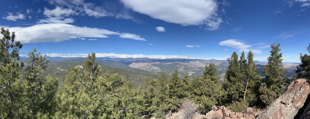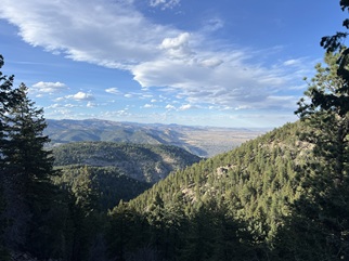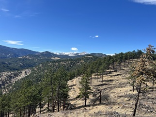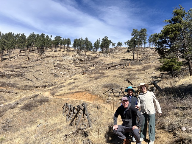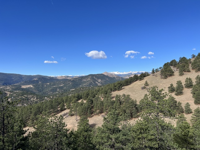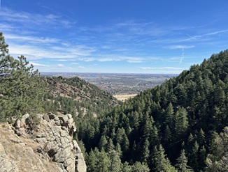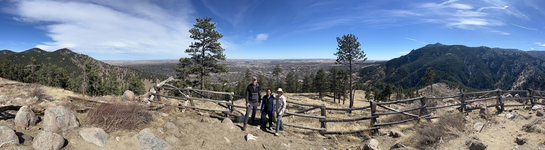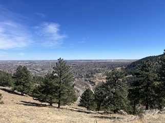 24) Green Mountain, Boulder County Open Space & Mountain Parks, Boulder, CO, March 29, 2026 - Another Sunday evening hike with our friend Desiree but we decided to try a different trail. I can't believe I'm saying this in March but we headed up into the front range mountains to find some cool air since the temperature was up into the 80s in Boulder. We drove up to the top of Flagstaff Mountain and then headed over to Green Mountain. However, we were all feeling pretty tired (Alan had spent the day felling and bucking trees!) and ended up running out of steam before making it to the top of Green. Despite turning around early we got to enjoy some nice views looking north along the Front Range with the long shadows being cast across Boulder from the setting sun in the west. A 3.3 mile up and back hike with 850 feet of elevation gain.