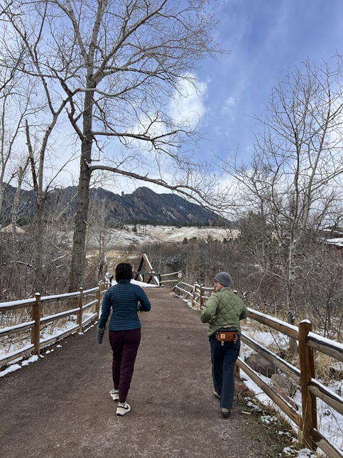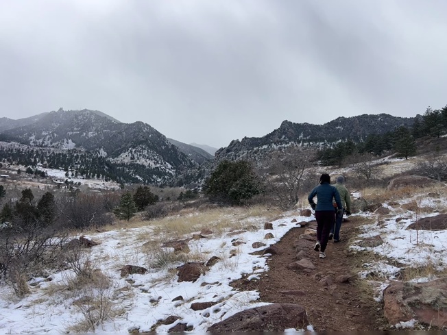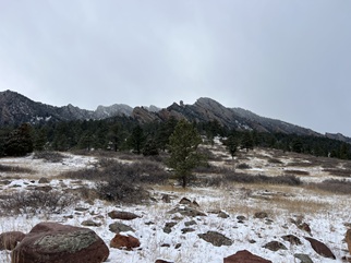 20) Homestead and Mesa Trails, South Mesa Trailhead, Boulder Open Space & Mountain Parks, Boulder, CO, March 15, 2026 - After such a dry winter we are happy for any moisture we can get along the front range. We had a small snow storm roll through dropping about half an inch of the white stuff down in Boulder and it came with below freezing temperatures so it didn't just melt out as if fell. To enjoy having a little snow on the ground we got together with our friend Desiree to hike our "short loop" from the South Mesa Trailhead. We hiked up Homestead Trail as usual and found it a muddy mess. Once we were back on the gravel of the Mesa trail the wind started to pick up a little and a few flakes fell from the sky so we decided to turn back. We skipped returning via the Towhee Trail since it would likely have also been sticky mud so we stuck with the more maintained Mesa trail all the way back to the trailhead. Not a particularly long hike but at least we got to feel a little bit of winter. A 3.2 mile loop with 600 feet of elevation gain.