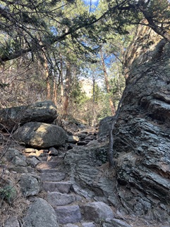 13) Chapman Drive & Tenderfoot Trail, City of Boulder Open Space and Mountain Parks, Boulder, CO, February 14, 2026 - After a couple of days relaxing to recover from all the hiking we did during Jamie's visit we were feeling a bit slothful. On a Saturday afternoon we decided to get out for another hike and since our last few hikes involved some elevation we opted to continue that by hiking Chapman Drive near the mouth of Boulder Canyon. The trailhead was recently rebuilt making it a much more formal hiking spot than it had been previously. This means a lot more traffic, particularly bicyclists who make a loop by cycling the Boulder creek bike path to the trailhead, then biking up Chapman Drive to the top of Flagstaff Mountain and then coasting down Flagstaff Drive back into Boulder. We did the climb from the trailhead all the way to the top but then came back down via Tenderfoot Trail which allowed us to avoid the bicycle traffic for half the return trip. A cloudless sky showed off the mountains of the Continental Divide which had been covered with snow by an overnight storm. Beautiful! A 5.2 mile loop with 950 feet of elevation gain.