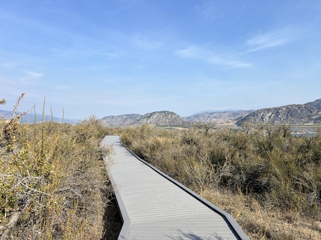 23) Osoyoos Desert Centre, Osoyoos, BC, September 28, 2025 - At the southern end of the Okanagan River (or at least the part that is in Canada) the valley widens out and becomes much drier. So dry, in fact, that is is classified as a desert. Having spent the last few days remarking on how lush the valley had been this area really helped us realize how much irrigation technology has literally transformed the surface of the Earth. Just outside the town of Osoyoos is the Oosoyoos Desert Centre which is an outreach facility to educate people about the fragile desert landscape. There was a mile long boardwalk loop with signs explaining the landscape, the animals and the history of the area. A nice roadside stop that allowed us to stretch our legs and learn something new.