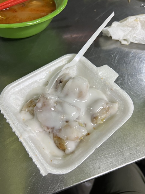 158) Scooter Food Tour, Sài Gòn, Vietnam, February 26, 2025 - To go with the soup we had chilled unsweetened jasmine tea. Again very refreshing. One sad bit that will be a lasting memory was a super cute orange tabby kitten that was sleeping next to our table. The kitten had been hit by a scooter last night and apparently had a broken leg. It had a little homemade neck "cone" on so hopefully that meant it had been seen by a vet but no cast or visible sign of treatment. I wanted to cradle the little cutie and protect it from the chaotic world it must survive in. After the stew Daniel pulled out the sticky rice he’d bought. It turned out to be chunks of banana, encased in sticky rice and then grilled over a wood fire. A sauce was then made from coconut milk thickened with tapioca powder. The cooked rice, the banana and the coconut mill combined to give it a rich, sweet flavor. Very nice!