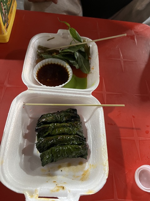 162) Scooter Food Tour, Sài Gòn, Vietnam, February 26, 2025 - Jonna the meat eater had little rolls made from grilled beef and peanuts wrapped in wild betel leaves served with a citrus dipping sauce.
