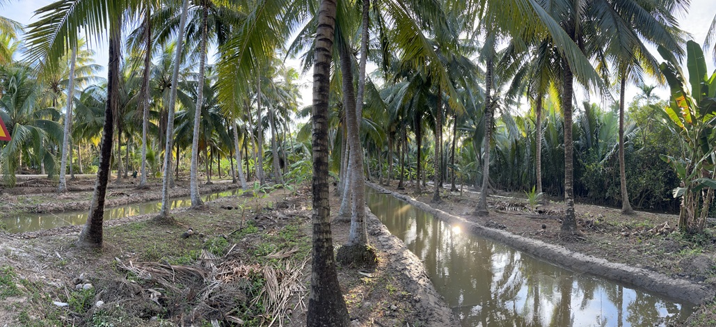 176) Thanh Tân, Bến Tre, Vietnam, February 27, 2025 - Our plan for lodging was a homestay with a family a couple of miles away. For the journey from the market to the homestay we loaded into two tuk-tuk trucks and bounced down a very rough road into town. Rough on the kidneys! Once we got to town and into a proper paved road the tuk-tuk ride wasn’t as uncomfortable but we only went a few blocks before it was time to unload. Then we walked about a 1/4 mile on a little paved path out to a smaller branch of the Mekong. Our homestay is a beautiful compound with a covered wooden deck built out over the river and a house with separate private rooms for us. The beds are rock hard but otherwise it is a nice place. We rested for about an hour, then met up at 5pm for an hour guided walk through the neighborhood. We got to see how each of the houses here has its own small canal that is used to water whatever they choose to grow and to hold whatever fish they want to raise. There were beautiful flower gardens, coconut farms, miniature fruit orchards, small animal farms for chicken or geese, and others filled in to house a business.