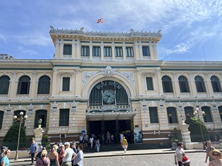 148) Bưu Điện Trung Tâm Sài Gòn (Saigon Central Post Office), Sài Gòn, Vietnam, February 26, 2025 - It was a short bus ride to our hotel - the Central Park Hotel. We couldn’t check into our rooms yet but did have access to a couple of rooms for our group to shower and freshen up after the overnight train. Most of the group were jumping right back on the bus for a 1 1/2 hour drive to visit the Co Chi Tunnels - a section of underground bunkers built by the Viet-Cong to support their military operations during the war. We decided to skip the trip and inside focused on seeing Ho Chi Minh City. First, we paid the hotel to get breakfast at their buffet which gave us some real food and some much needed caffeine. After that we, along with one other tour member Angela, met up with our guide Minh in the lobby. He brought us on a 1 1/2 hour walking tour of the central part of old Saigon. This included seeing Book Street, the old 19th century French Central Post office, the Opera house, the old US CIA building where the famous "Last chopper out of Saigon" photo was taken, Independence Palace, the Notre Dame of Saigon Cathedral, Bùi Viện Street, and the Ben Thanh Market. Whew! A thorough overview of Ho Chi Minh City.