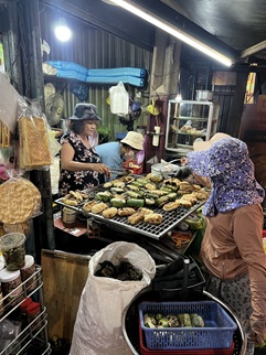161) Scooter Food Tour, Sài Gòn, Vietnam, February 26, 2025 - Our next stop was our final one. However, we would be trying dishes from multiple vendors so there was still plenty of food to go. We rode to the flower market which operates 24 hours a day. As a result there are lots of food vendors here selling to all the people working and visiting the market. We found a little table - really a knee high crate with tiny plastic stools for chairs. More of a squat than a sit. Our first dish here was split: I had fried quail eggs with cheese, spring onion and crunchy fried shallots, dipped into a tamarind sauce. Very rich and creamy!