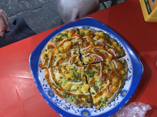 163) Scooter Food Tour, Sài Gòn, Vietnam, February 26, 2025 - After that round was a relatively new addition to Vietnamese street food - a Vietnamese Pizza. This is a piece of rice paper covered with fried egg then topped with chopped green onions, mayonnaise, chili sauce and (for Jonna) tiny shrimp. The whole thing is grilled giving it a smoky flavor. To go with these two courses I had a big glass of sugar cane juice that was also very tasty.