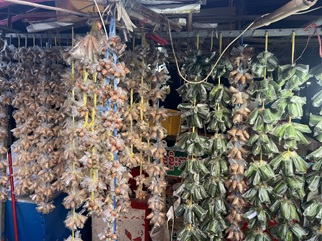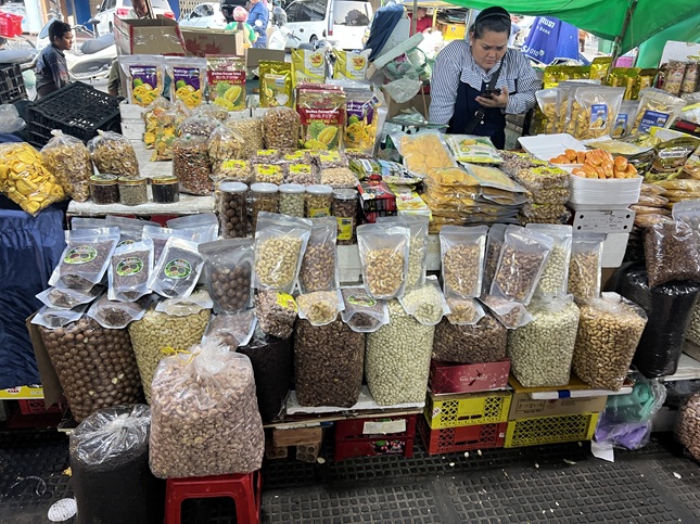 190) Tuk-Tuk Tour, Phsar Thum Thmei (Central Market), Phnom Penh, Cambodia, March 2, 2025 - Our first stop was Phsar Thum Thmei ("New Grand Market") which was built by the French in 1937. The stalls were starting to close for the evening when we arrived but there were still enough open for us to get an idea of the place. Flowers, clothes, fruits, nuts, bugs (larvae, crickets, grass hoppers and spiders), seafood and lots more. Cashews are one of the main crops of Cambodia so Jonna bought a bag for a snack.