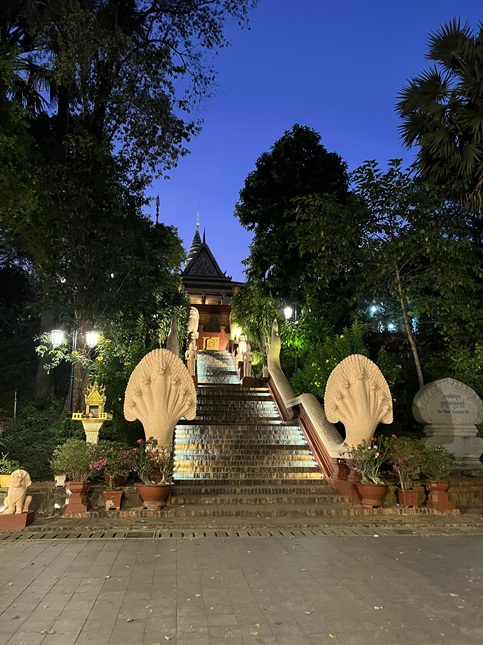 194) Tuk-Tuk Tour, Wat Phnom Daun Penh (Mountain Pagoda), Phnom Penh, Cambodia, March 2, 2025 - From the market we got back in the tuk-tuks for a drive to the Yeay Penh Statue. This monument tells the mythic founder of the city and there are decorations around the monument telling the story of the magical discovery of some statues which caused the building of a hilltop temple which then grew into Phnom Penh. Across the street from the statue is the temple of Wat Phnom - the modern temple built in the location of the one from legend. It is a beautiful building with typically elaborate decorations and statues which typify Cambodia temple architecture. The inside of the temple was closed for the night but we could walk around the building and see some of the outside shrines. We also got to watch the flying fox fruit bats flying through the garden surrounding the temple. The bats have wingspans a few feet across so very cool to see arcing overhead.