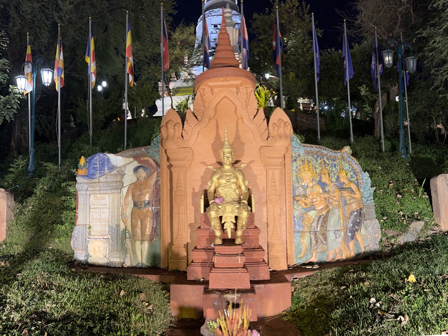 195) Tuk-Tuk Tour, Wat Phnom Daun Penh (Mountain Pagoda), Phnom Penh, Cambodia, March 2, 2025 - One of the outside shrines had a sculptural wall telling the story of King Sisowath who reunified Cammbodia in 1907 after the western portion of the ancient Khmer empire had been take by Siam (Thailand). The statue of the king looks down on a giant lawn clock originally gifted by the French in 1960 and then later renovated by the Chinese in 2000.