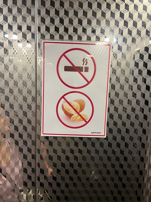 199) Phnom Penh, Cambodia, March 2, 2025 - One clear sign you are in southeast Asia: In addition to "No Smoking" signs in the hotel elevator there is also a "No Durian" sign. Our first day in Cambodia was a success. It is an interesting culture (91% Buddhist means a calmness that is palpable) and a much less frantic environment than Vietnam.
