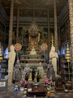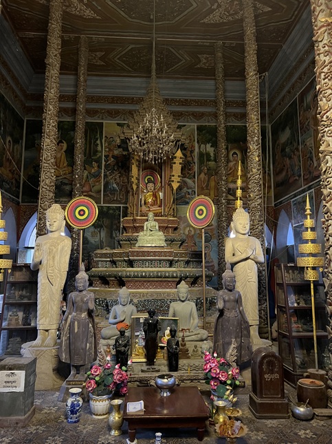 222) Tuk-Tuk Tour, Damrey Sor Pagoda, Battambang, Cambodia, March 4, 2025 - Next we walked into the Damrey Sor Pagoda complex where we got to visit the main shrine. This Buddhist temple was built in the 1890s and shows architectural and artist influences from Europe, Thailand and Cambodia. It would normally be closed by the time we arrived but a very kind caretaker opened it up so we could look around.