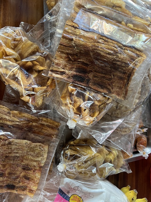 231) Banana Snack Shop, Bicycle Tour, Battambang, Cambodia, March 5, 2025 - We got back on the bikes and had a short ride to our next stop. This time it was a stilt house surrounded by banana trees. The family that lives here sells fresh banana but also makes a selection of snacks made from bananas (and a couple of other starchy things like taro, potato and plantain.) We got to watch the mother and daughter thinly slicing banana and laying out the pieces into a mat which is the air dried into fruit leather. They also make bite-sized snacks from dried banana with other flavors added like sweetened condensed milk, or sugar, or other fruit. We ate some samples and got to talk with the very cheerful matriarch of the family. We did have a chance to buy some of their snacks but it was never pushed or even advertised.