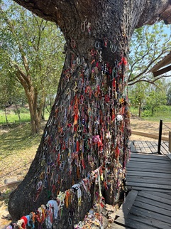 208) Choeung Ek Genocidal Center, Phnom Penh, Cambodia, March 3, 2025 - The museum has detailed information about the key Khmer Rouge officers and information about the five members who have been brought up on Crimes Against Humanity charges. The museum also had a 15 minute film that talked specifically about how this camp operated. Horrifying. This tree, supposedly the site were babies were killed, is now a living memorial with trickets, meditation beeds, toys and other items left to commemorate the dead.