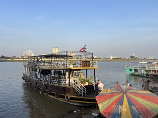 211) Mekong River Cruise, Phnom Penh, Cambodia, March 3, 2025 - We spent two hours on the cruise and our tour guide did a very nice thing - just as the sun set and the sky was glowing pink she asked us to spread out so we had some space alone and to think about the day. The boat cut its engine and we had a quiet moment to reflect on everything Cambodia has been through while gazing out on what it is busy becoming. It was a poignant moment.