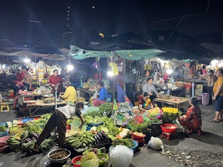 212) Phnom Penh Night Market, Phnom Penh, Cambodia, March 3, 2025 - After the cruise Jonna and I decided to walk back - about 20 minutes. Along the way we found an Indian Restaurant - perhaps of questionable quality. The food tasted good but there were also some signs that maybe it wasn’t the best place. Thankfully, we didn’t get sick and regret our dinner choice. At least the price was right - $12 for a dinner for two. Just around the corner from the restaurant was the night market. It was gritty and dirty but also a very local part of Phnom Penh in contrast to the tourist areas. We also stopped en-route at a convenience store where I got snacks for tomorrow and an ice cream bar for tonight. We got back to the hotel around 8:30pm which gave us time to pick up the laundry we’d sent out yesterday for cleaning and to shower off the sweat and bug repellent from today. Tomorrow we leave the capital to see some of central Cambodia.