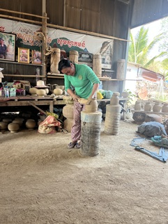 213) ពូមីងធ្វើឆ្នាំង (Pottery House), Khum Srae Thmei, Cambodia, March 4, 2025 - p It was time to pack up and head to western Cambodia. So we woke up at 6:45am in order to get breakfast at the hotel, reorganize our luggage, and check out. At 8am we filed onto a big bus and started to drive out of Phnom Penh. After a couple of hours we made a quick bathroom stop and turned off the main road to drive to the village of Svey Chrum. Here we visited the home of Nem - a traditional potter. She showed us how she makes clay rice pots based to the technique passed down from two previous generations of women potters. She doesn’t use a potter’s wheel but instead uses two wooden tools: one that is round like a ball with a small handle and the other that is a bamboo paddle. She rolls out clay, then forms it into a tube. Next she inserts the round shaping tool and beats on the outside of the clay to stretch the clay onto a spherical bowl shape. Next she shaped the rim. Then she finalized the shape of the bowl and added decoration. Then she finished by stretching the side around to form the bottom of the bowl.
