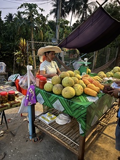 224) Tuk-Tuk Tour, Sangker River Farm, Battambang, Cambodia, March 4, 2025 - It was back in the tuk-tuks but now for a 15 minute ride out of town to the village of Wat Tamim. We arrived after sunset but one of the tuk-tuk drivers was related to a woman that owned a pomelo farm and she stayed out at her fruit stand so we could sample the two types of pomelos she grows: one with white flesh that is sweeter and another with pink flesh that is more sour.