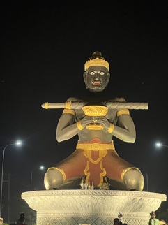226) Tuk-Tuk Tour, Lok Ta Dambong Kra Nhoung (Ta Dumbong Statue), Battambang, Cambodia, March 4, 2025 - We also got to see the swinging suspension bridge built over the Sangker River used to connect this village with villages on the other side. It was now dark so we headed back to Battambang. However, the tour wasn’t over as we had two more stops. The first was at the main roundabout coming into town to see the giant statue of Ta Dumbong Kro Nhong - a mythical protector of the area.