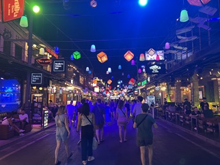 239) Pub Street, Siem Reap, Cambodia, March 5, 2025 - We had 1 1/2 hours before boarding a bus and I thought the guide may have to drag me kicking and screaming from the air conditioned room but I managed to rally in time to pack and check out. We had skipped lunch so I hit up the poolside bar for a soda and that helped spark me awake for the three hour bus ride. The three hour bus trip from Battambang to Siem Reap was uneventful and we rolled into Siem Reap at 5pm. Our first stop, before going to our hotel, was the ticket office for the Angkor sites. These sites are the reason little Siem Reap (500,000 inhabitants) is the most visited place in Cambodia and they have built a big, modern tourist center to handle selling the tickets. We picked up our tickets which required the official taking our photo - the ticket is valid for three one day visits anytime over the next ten days. This means we can use it with the tour for the next two days and still have one more day for the two extra days we are spending in Siem Reap. Score! Next was the drop off and check-in at the hotel. We got situated in our room and then headed back down to join our tour guide for a short walk around the tourist area. We visited Wat Preah Prom Rath which is a large Buddhist temple in the middle of Siem Reap. The temple buildings were closed but we could walk around the grounds. Next we walked over to Pub Street which is right next door to the night market but is a huge contrast since it is a brightly colored row of bars and restaurants packed with tourists. The group decided to stop at one of the restaurants there for dinner but Jonna and I decided we would try something a little smaller so we peeled off and went our own way. We had read a positive review for Tevy’s Place and based on the people waiting to get in it appeared to live up to the reputation. We sat outside in the heat for 20 minutes but eventually got seated inside. The food was very good and based on the reviews I felt safe ordering raw vegetables meaning I had an excellent green salad - something I’ve been missing for the past three weeks. After dinner we walked back to the hotel - it was still hot and muggy out - where we turned on the air conditioner and headed straight to bed. We have a very early morning tomorrow so I was thankful to nod off quickly!