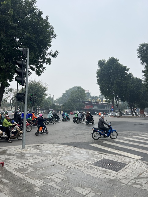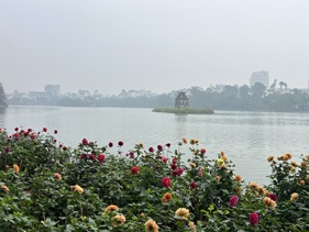 2) P. Quang Trung, Hanoi, Vietnam, February 12, 2025 - Next we cast our sight further afield with a 30 minute walk to Hoàn Kiém Lake – the center of Old Hanoi. Along the way we got a sense of Hanoi – sidewalks packed with parked scooters and pop-up food stalls. Every stop light was a drag race start for dozens of scooters, many loaded down with a family of four or stacked high with goods. Cars squeeze three wide on a road marked for two lanes. Old men in military uniforms patrol the streets and young people walk blindly through traffic with their eyes firmly fixed on their cell phones. Red and yellow flags fly in front of every building and murals of "Uncle Ho" look down every few blocks. The air pollution makes your eyes sting and, despite lots of shop owners sweeping in front of their stores, every walking surface is covered in things you’d rather not think about. Tet, aka New Year, just passed and there were flowers bursting out in all the parks – peach blossoms and roses and chrysanthemums were everywhere.