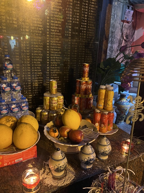 7) Bảo Tàng Phụ Nữ Việt Nam (Vietnamese Women's Museum), Hanoi, Vietnam, February 12, 2025 - All of the shrines have a wide variety of offerings on display. While fruit and incense are the most common there are also stacks of more mundane commercial foods like bottled water, fruit juice boxes and even soda.