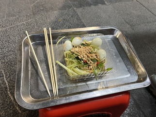 16) Hanoi Street Food Tour, Hanoi, Vietnam, February 12, 2025 - Then our next stop was green papaya salad accompanied by lemon tea and green tea for drinks. This was so delicious that we ended up coming back to this food cart two more times over the next week to get more!