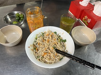 22) Hanoi Street Food Tour, Hanoi, Vietnam, February 12, 2025 - Despite us already being stuffed our next stop was a Phó shop tucked into a little alley for noodles with scrambled egg, onion and peanuts. A huge bowl was $1 and was so delicious I couldn't leave it unfinished!