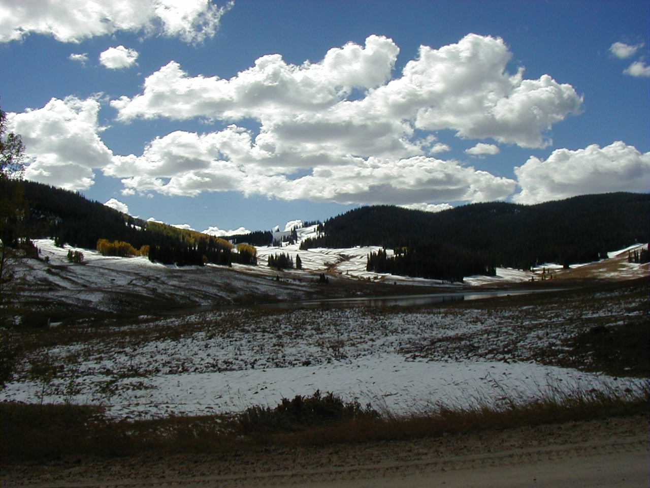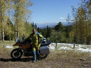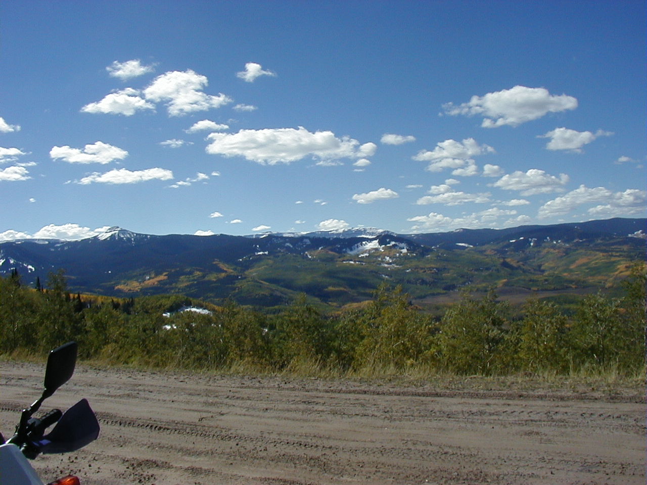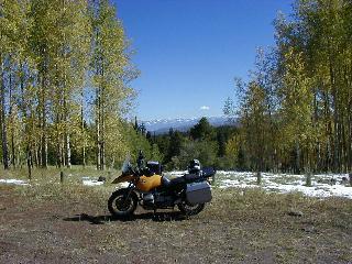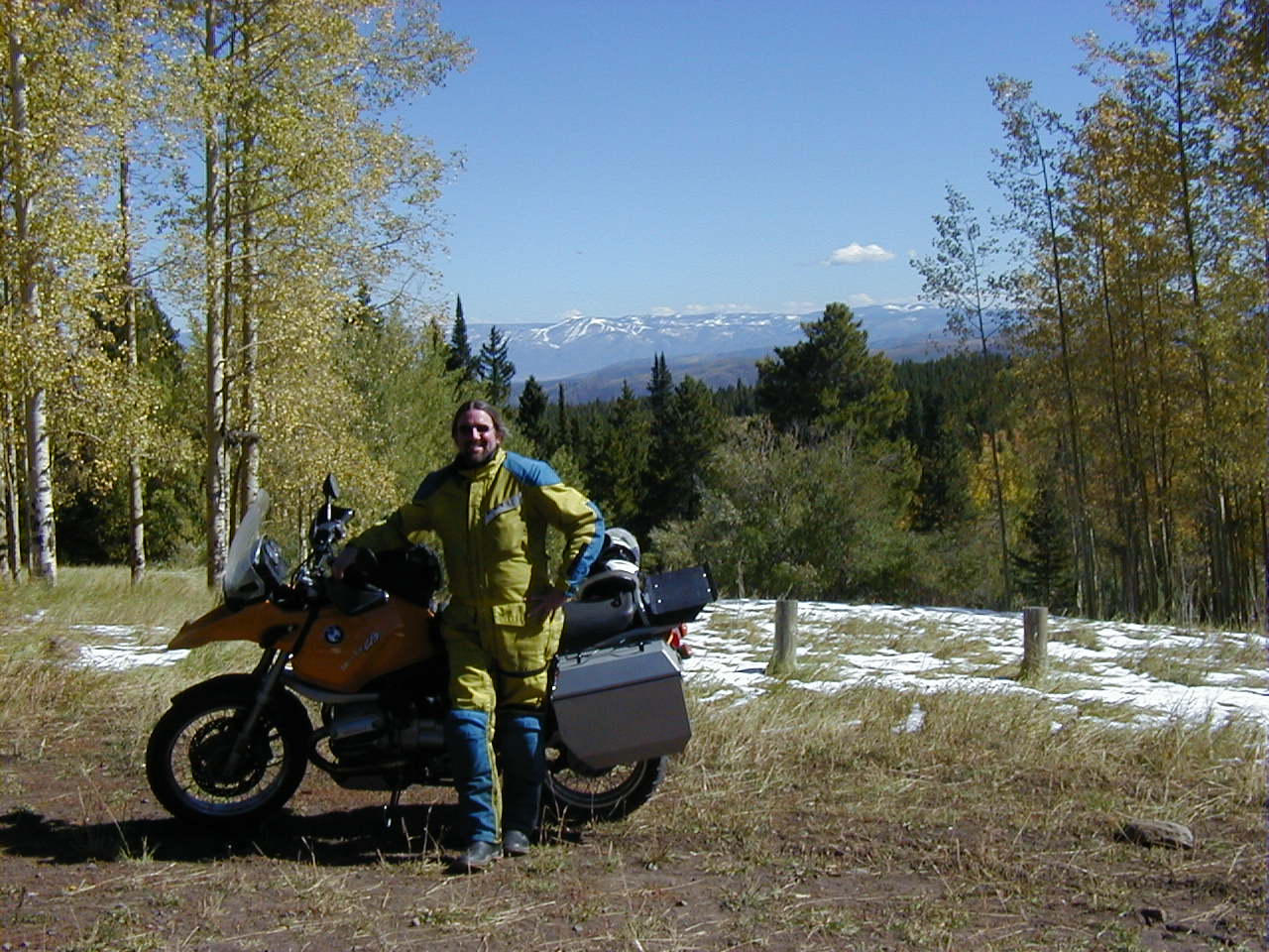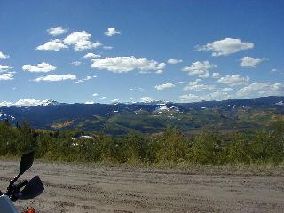 My friends Todd and Tony were spending a weekend exploring some forest service roads in western Colorado. I took off after work on Friday and met up with them in Steamboat Springs. On Saturday, we did about 200 miles of riding, with about 90% of that being graded dirt roads. The route took us along the north side of the Flat Tops Wilderness Area, through the Routt and White River National Forests. The the leaves were changing and fresh snow covered the high country. A beautiful ride!