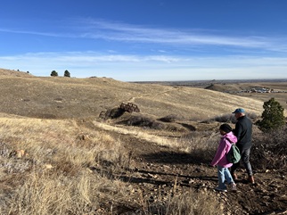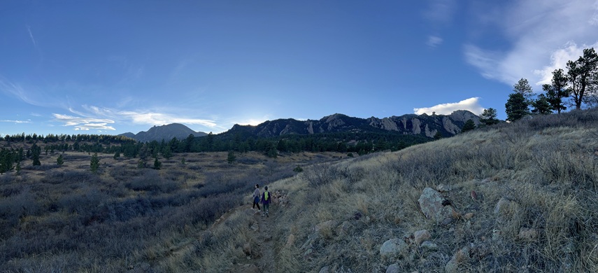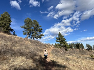 48) Homestead, Mesa and Towhee Trails, South Mesa Trailhead, Boulder Open Space & Mountain Parks, Boulder, CO, November 16, 2025 - After a two month break from hiking with our friend Desiree, mainly because we were out of town for fives weeks, we resumed our evening hike routine with a Sunday get together at South Mesa Trailhead. With the time change and the shorter days of Fall/Winter we started in the late afternoon and finished just as sun was setting. The landscape was waist high dry grass - just the thing to raise our anxiety about fire - but it was beautiful in its own way. We hiked our short loop starting on Mesa Trail, going up Homestead Trail to where it rejoins Mesa Trail. Then turning back for a short way on Mesa before turning onto Towhee trail for the bulk of the return to the trailhead. We got to watch a nice sunset but also got to feel the temperature drop as the sun went behind the mountains. Soon, our "evening" hikes will have to start just after we eat lunch! A 3.1 mile loop with 500 feet of elevation gain.