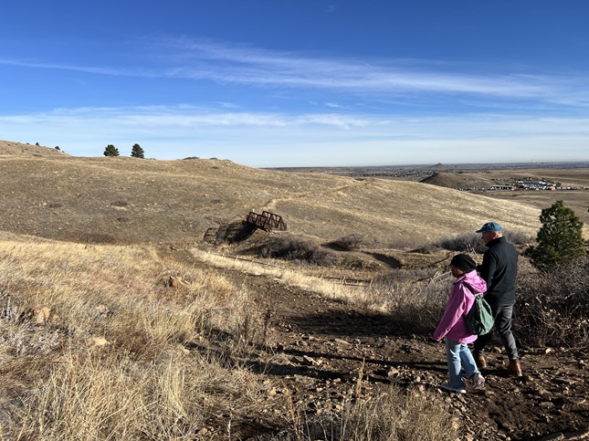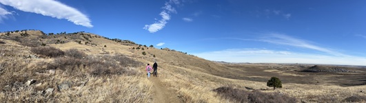 47) Lichen Loop Trail, Heil Ranch Open Space, Boulder Open Space & Mountain Parks, Boulder, CO, November 14, 2025 - An unseasonably warm day made for great weather for Jonna and Alan to get together with our friends Kristin and Steve down in Boulder for an mellow outing. We drove out to Heil Ranch Open Space just north of Boulder where we had a picnic at the trailhead and then did a little walk to stretch our legs. This was our first time hiking at Heil Ranch since the big fire back in 2020 and it has drastically changed the park. What was previously a stroll through a forest is now a big open meadow dotted with burned tree trunks. This late in the year the meadows were filled with waist-high dry grass, wilted cactus and a few tiny green pine saplings. The open hillside makes for panoramic views of the ridgeline to the west and bathed us in warm sunshine which helped offset the cool gusting wind. A very nice stroll and a chance to catch up with friends we haven't seen in a couple of months. A short 1.6 mile loop with a modest 300 feet of elevation change.