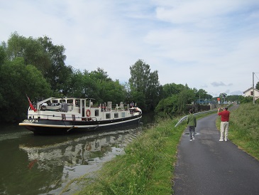 55) Because the barge moved slowly and stopped often to tranverse the numerous locks you could walk or ride a bike down the path that runs along side (and was once a towpath where horses or mules pulled early barges) without falling behind.