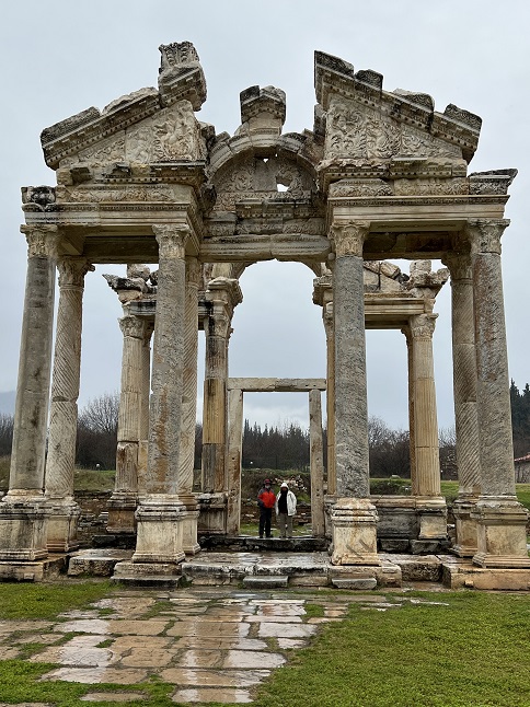 41) Tetrapilon, Aphrodisias Archeological Site, Geyre, Turkey, March 5, 2022 - We were on the move again after our day off in Selçuk. We woke up to pouring rain and a forecast which said it would continue all day. We bundled up planning to be cold and wet. After a quick breakfast we checked out of the charming little hotel (Amazon Antique) in Selçuk and turned inland. We retraced part of our drive in by climbing back up onto the mountainous plateau to the east and then continued up the wide valley past where we had driven in from the south two days before. We drove east for two hours and never had a break from the continual, monotonous traffic and seemingly single long town. From Aydin to Nazilli in particular the E-87 was unremarkable. Finally we turned off to the south and immediately we began driving through farmland and little villages as we climbed up on a ridge. 35 km later we found our destination: the UNESCO site of Aphrodisias. This ancient city was built up in the mountains for a single purpose - marble. There were large marble quarries in this area which made it an important resource center for all the cities in Turkey. Additionally, the marble attracted some of the best sculptors in the region. On the power of these two things Aphrodisias became a wealthy city with a population of around 150,000. The site today is amazing with a number of major buildings some of which are partially reconstructed and others just really well preserved. There were many beautiful sights including the massive Tetrapylon gate.