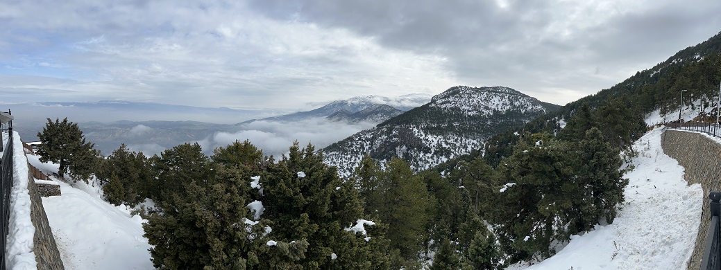 45) Denizli Teleferik, Denizli, Turkey, March 6, 2022 - Buckle Up, readers, these next few descriptions are gonna be long ones (and I am sure you thought the others were already long!) This day we went from snow to sand. It was a tremendous day. We decided to skip swimming in the over-priced "Antique Pool" at Hierapolis in the morning and instead hit the road right after breakfast. It was foggy but not raining so we took that as a good sign. That immediately proved true as the clouds started to break up as we drove into the huge city of Denizli. Jonna had found info on a cable car up to the top of a mountain on the southern edge of the city but we’d assumed the fog would make that pointless. So with the clearing skies we made a quick change of plans and headed there afterall. Score! The tram cost the equivalent of $1 each and climbed way up to a snowy summit.