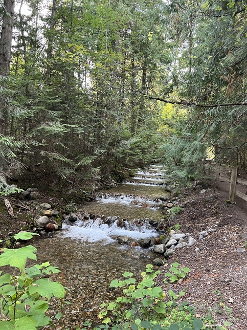 3) Kokanee Creek Provincial Park, Kootenay Lake (West Arm), Nelson, BC, September 19, 2025 - The salmon ladder was just a manmade stream with manufactured falls that allowed the fish to swim upstream against the current. The actual Creek, just a few yards further to the west had culverts, falls and bridges that would have impeded the fish's ability to move upstream. We were able to hike a loop from our campsite, over to the Visitor's Center (and the fish ladder) and then into a forested area to the north before circling back to our campsite.