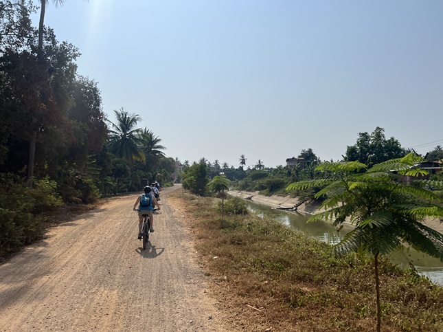 233) Bicycle Tour, Battambang, Cambodia, March 5, 2025 - Next we were back on the bikes for a little longer of a pedal. Part was on a dirt road and then onto a paved road across a dam over the canal that supplies water to this community. We then turned into an area with slightly larger lots which were used for fruit orchards. Have I mentioned the heat and humidity? Especially next to a big canal? Whoo...